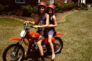 When I think about what matters most to me today – things like nature, adventure, creativity, and freedom – it takes me back to my childhood and how much those experiences have shaped who I’ve become. I’m thankful for parents who gave us this beautiful space and so much freedom to explore and play. When I consider all the risky things we did, it gives me proof that kids are surrounded by a pack of angels! I mean, in this photo, we’re about to jump a stack of concrete cinder blocks with a ramp built of plywood and 2X4s and I’m riding that dirt bike in shorts and am barefoot!